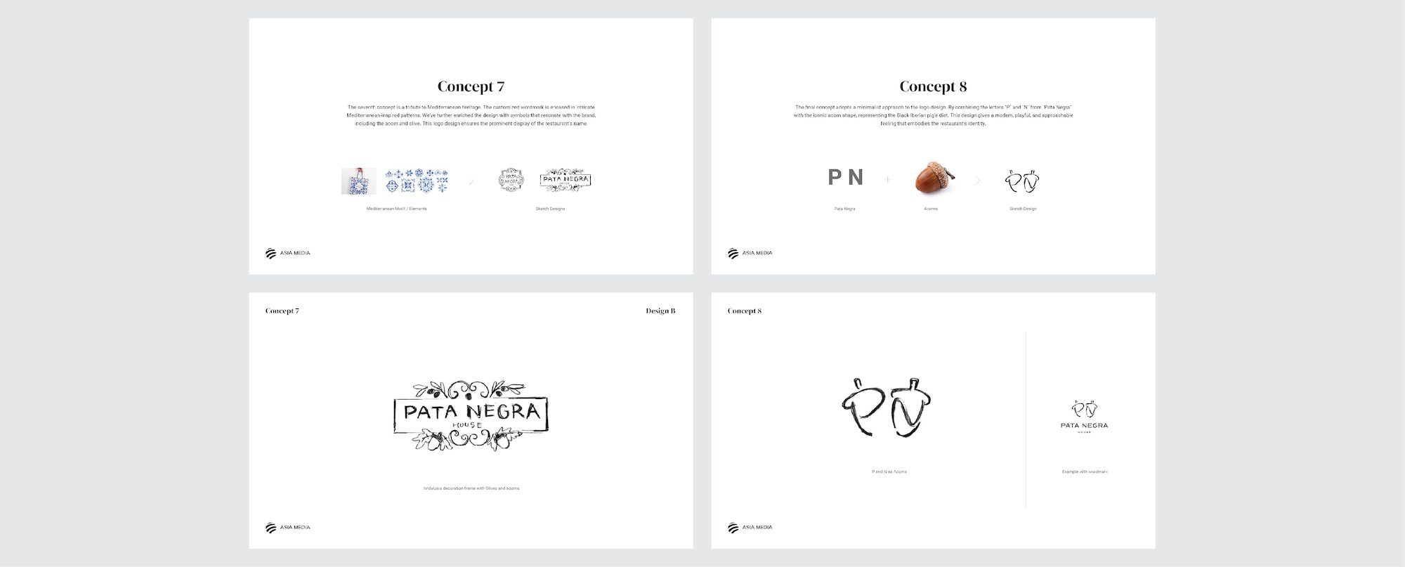 Le concept final adopte une approche minimaliste pour le design du logo. En combinant les lettres “P” et “N” de “Pata Negra” avec la forme emblématique du gland, représentant le régime alimentaire du porc ibérique noir. Ce design donne une sensation moderne, ludique et accessible qui incarne l'identité du restaurant.