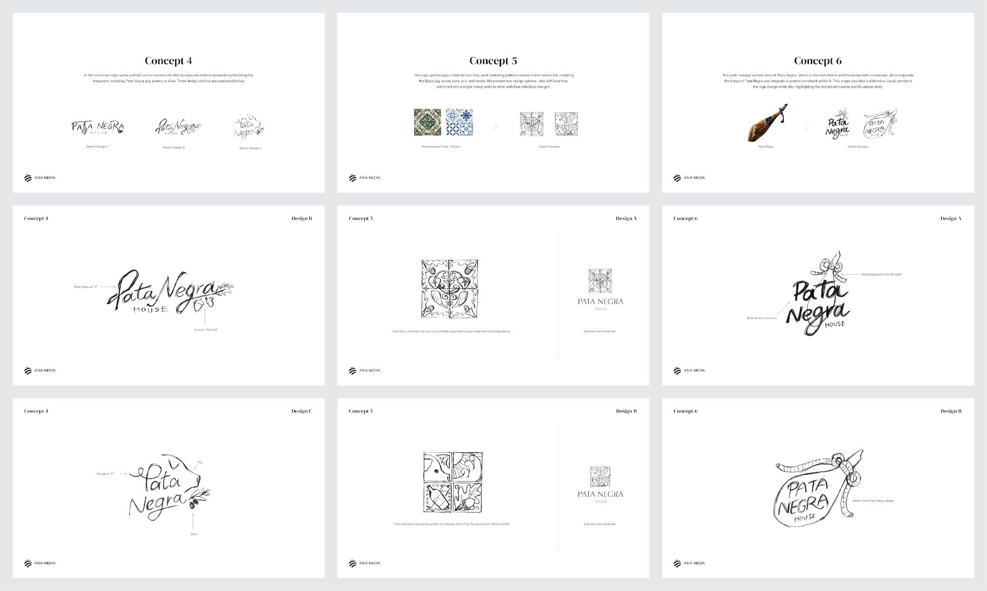 Dans le quatrième concept, nous avons conçu des marques de mots personnalisées qui intègrent des éléments distincts symbolisant le restaurant, y compris Pata Negra, le porc, les glands ou les olives. Trois options de design sont présentées ci-dessous.