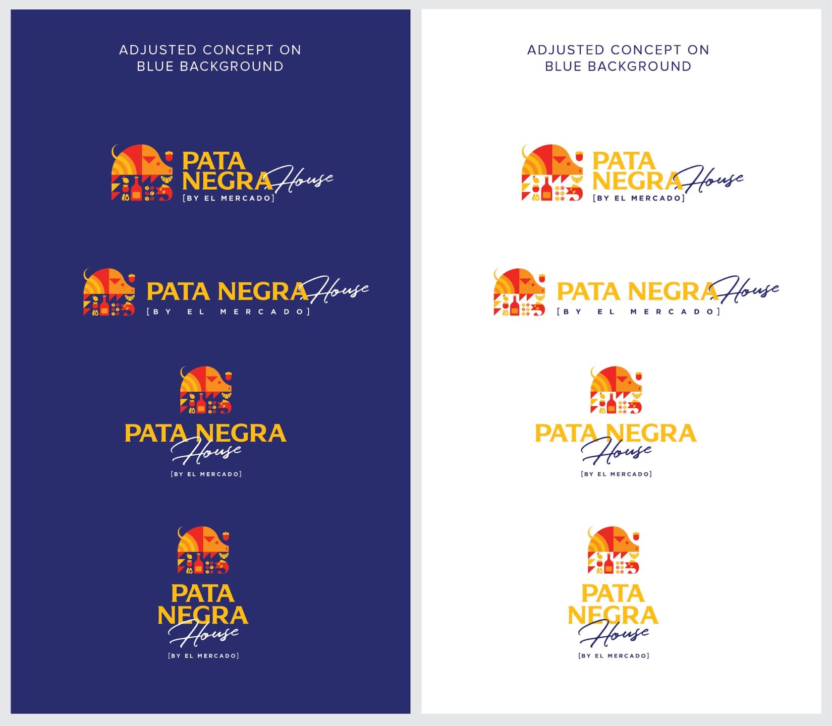 Le sixième concept se concentre sur “Pata Negra”, qui est le thème principal et le nom du restaurant. Nous incorporons la forme de Pata Negra et intégrons une marque de mots personnalisée à l'intérieur. Cette forme fournit une identité visuelle distinctive au design du logo tout en mettant en avant le nom du restaurant et son histoire unique.
