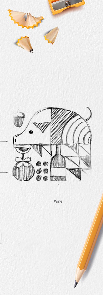 Dans le deuxième concept, nous nous inspirons du cubisme, un mouvement artistique dont les racines se trouvent en Espagne. Nous fusionnons harmonieusement des éléments iconiques de la cuisine et de la culture espagnoles et andalouses – le porc noir (Pata Negra), le vin et la tomate – en un symbole accueillant conçu dans un style cubiste ludique.