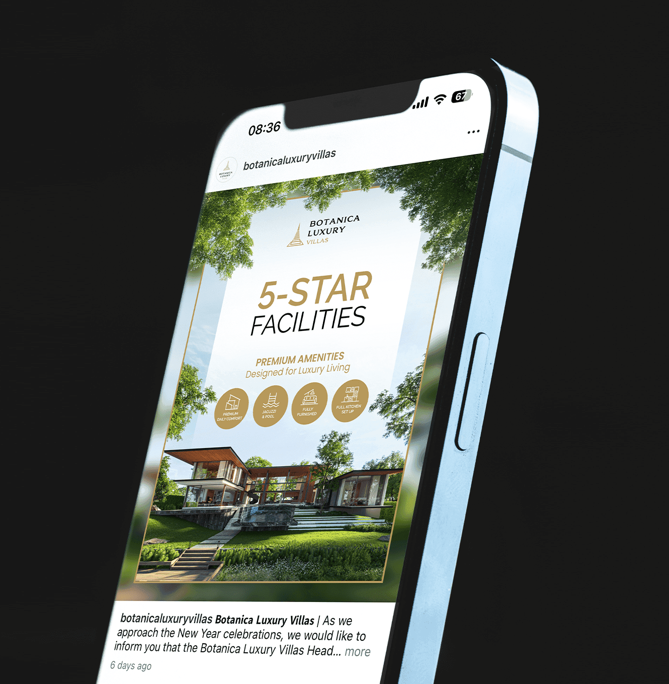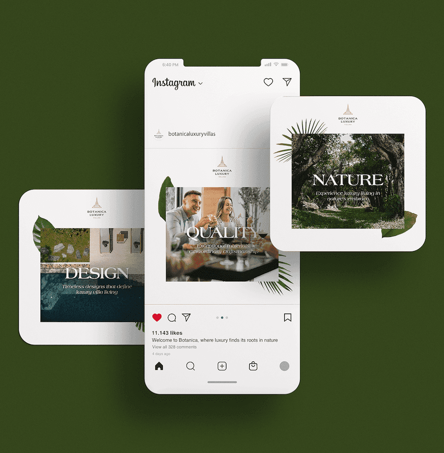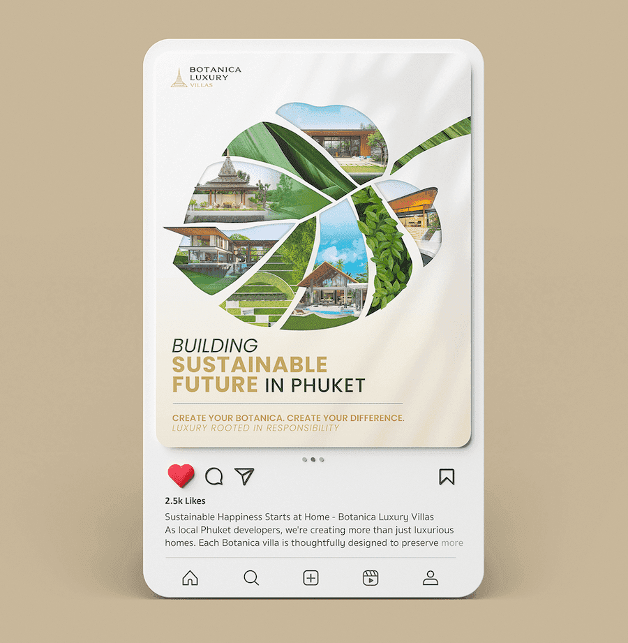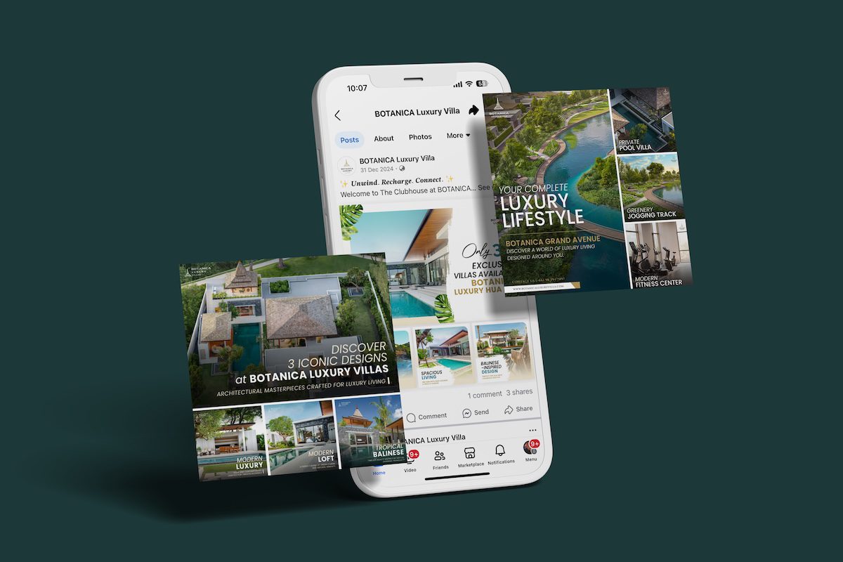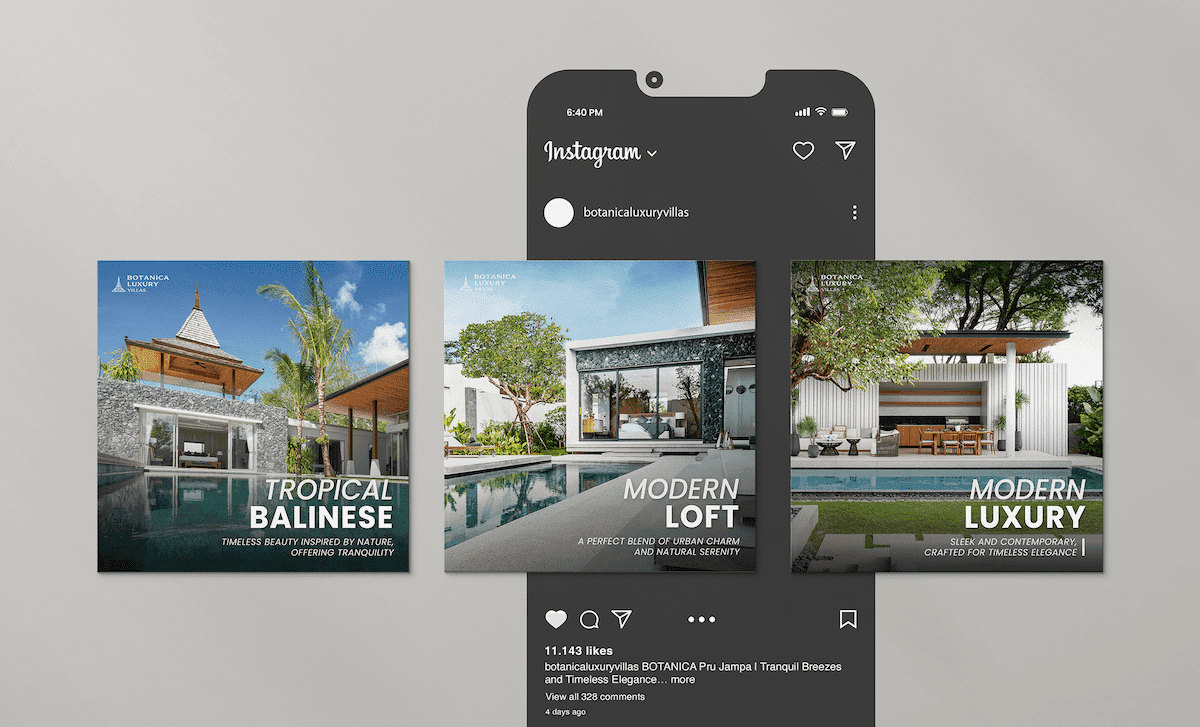 Un aspect remarquable de ce projet est la création de publications sur les réseaux sociaux sur mesure qui capturent l'apparence, la sensation et l'atmosphère uniques de chaque style de villa Botanica. Des lofts modernes aux designs balinais tropicaux, chaque publication s'aligne avec la marque Botanica tout en reflétant l'identité distincte du développement spécifique. Cela garantit la cohérence de la marque tout en mettant en valeur l'individualité de chaque projet.