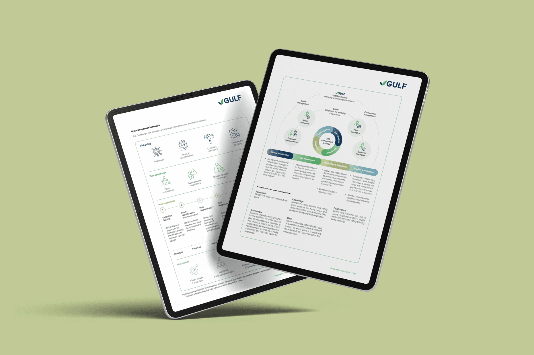 When Gulf needed a design partner to produce its annual Sustainability Report, the scope went well beyond standard layout work. The report required a complete visual framework that could present complex ESG data, corporate strategy, and operational achievements across more than 160 pages while maintaining clarity and visual consistency throughout. Our team managed the full production lifecycle from initial layout concepts through final print-ready files, working through over three months of structured revisions and feedback rounds with Gulf's sustainability and communications teams. Every section, from governance frameworks to environmental performance metrics, was designed to meet both international reporting standards and the brand's corporate identity guidelines.