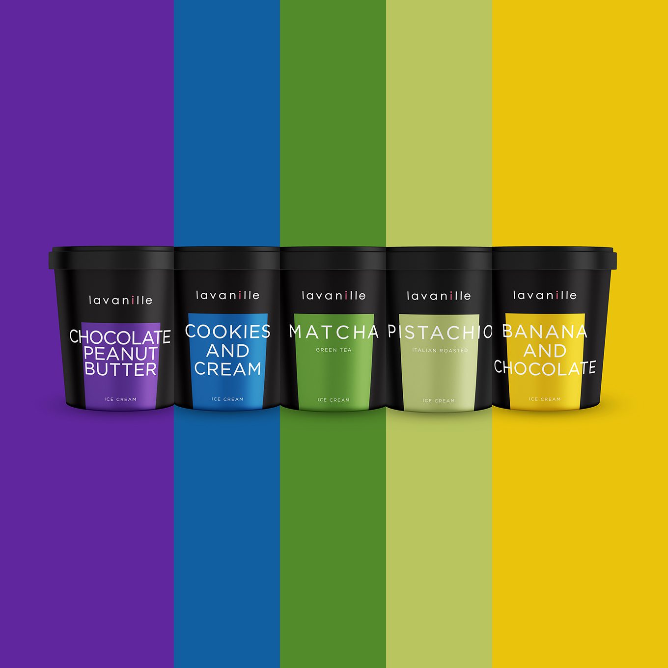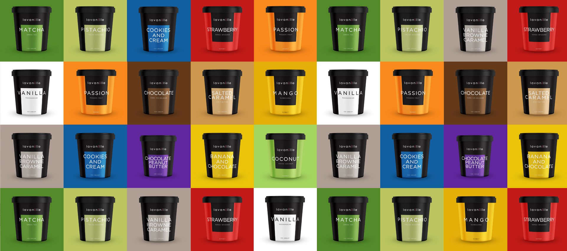 Des brownies au caramel à la vanille aux beurres de cacahuète au chocolat, yuzu et tout un monde de saveurs supplémentaires. Pour le design de l'emballage, nous voulions transmettre cette fraîcheur que vous ressentez lorsque vous dégustez une boule de glace. Les couleurs de l'emballage ont été affinées pour correspondre à chaque saveur spécifique et fonctionnent également en harmonie lorsqu'elles sont ensemble dans le réfrigérateur.