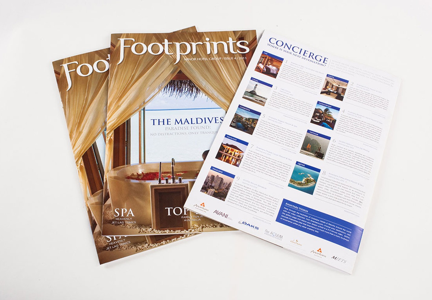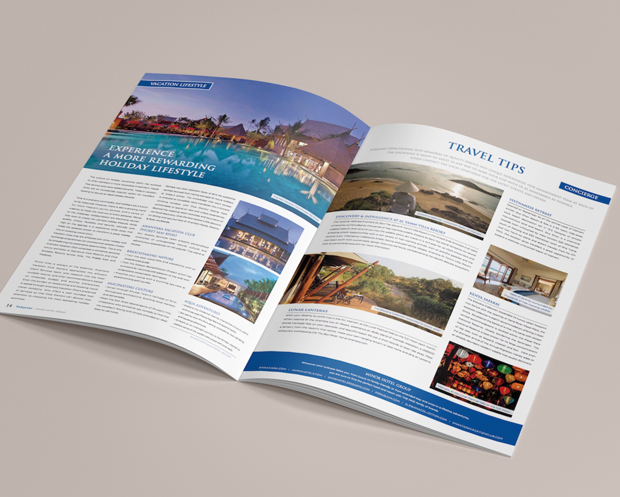 Nous avons établi une relation de travail enviable avec Minor qui a conduit à une multitude de contacts en matière de design, y compris des brochures pour Anantara et Layan Residences ainsi que des panneaux d'affichage et des calendriers.