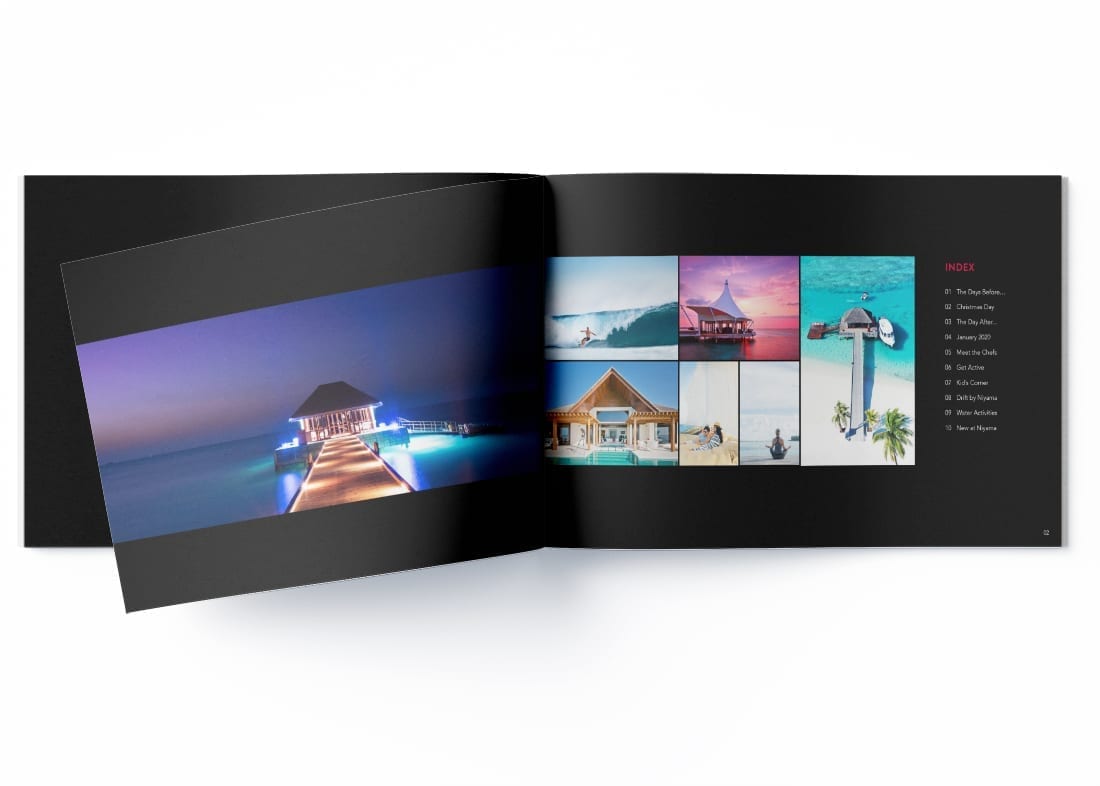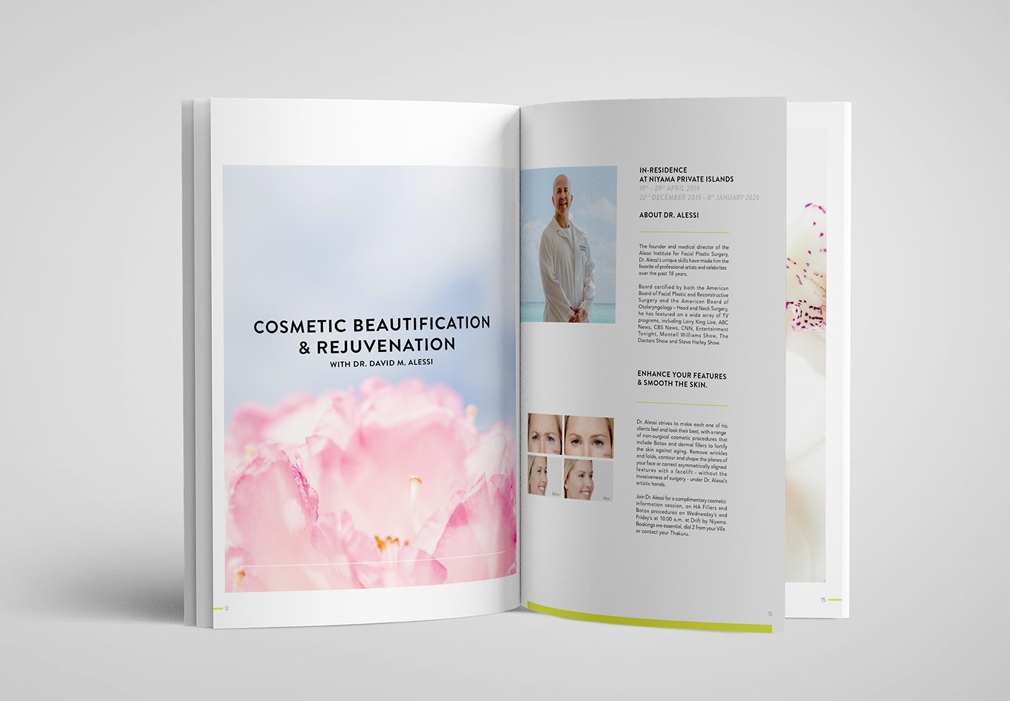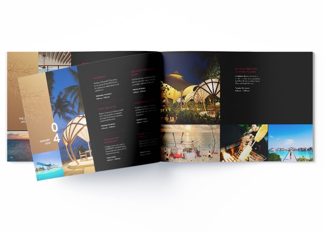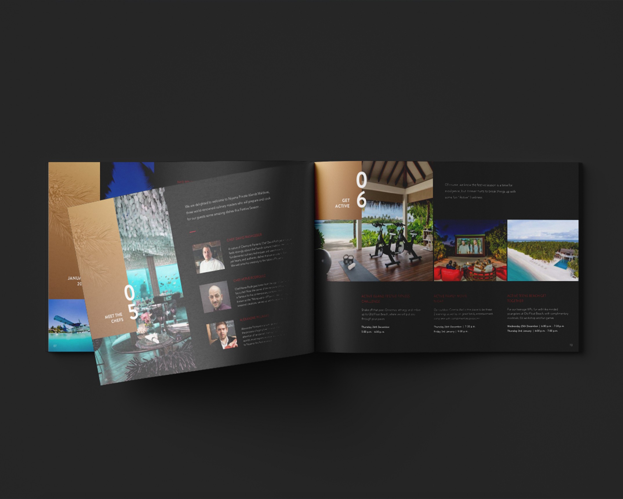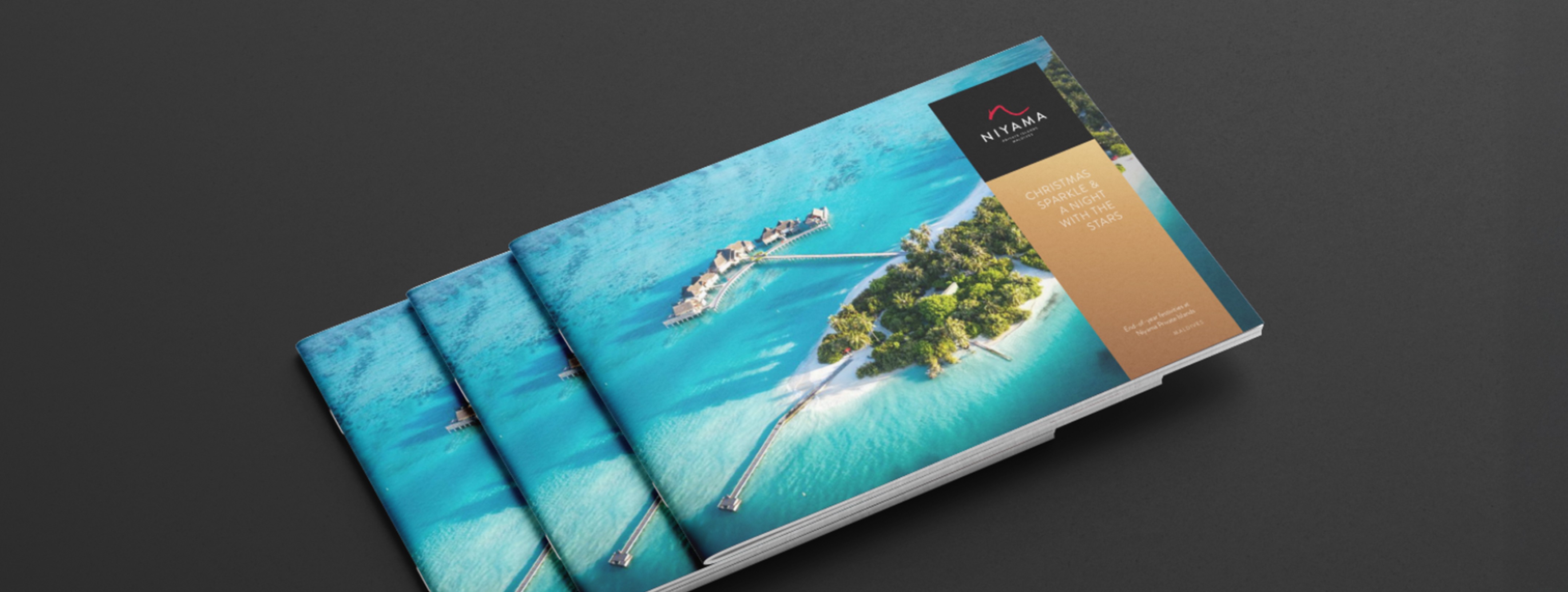 Nous sommes engagés par le complexe hôtelier 5 étoiles Niyama pour concevoir tout leur matériel imprimé, y compris les brochures, les affiches et les menus. Des mises en page dynamiques, des visuels époustouflants, des titres audacieux, un texte clair et précis sont les marques d'un programme d'activité très réussi pour une organisation qui exige rien de moins que la perfection.