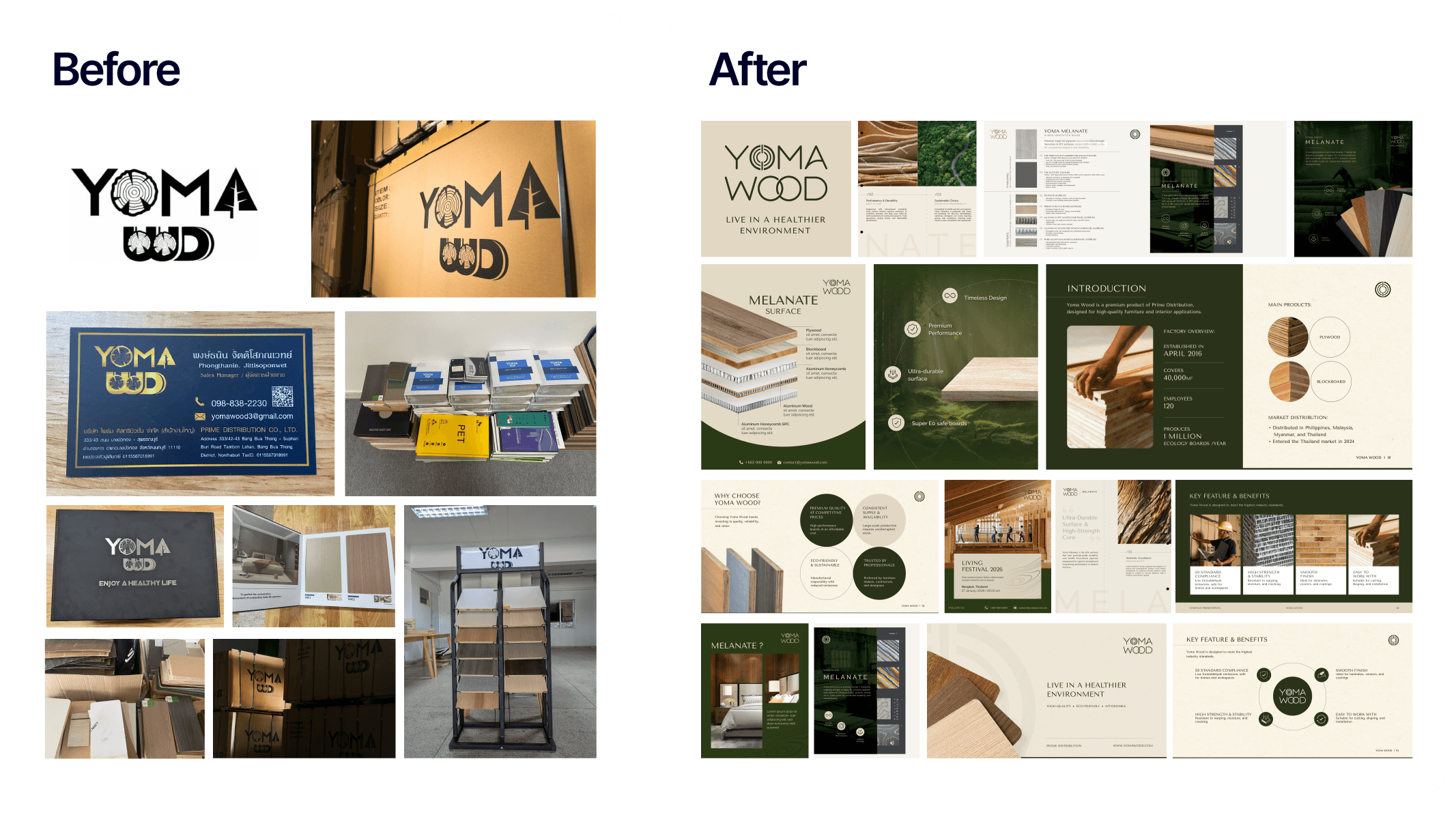 Yoma Wood operates in the competitive Thai construction materials and wood products industry. Established in 2016, the company distributes premium wood products across the Philippines, Malaysia, Myanmar, and Thailand. To strengthen its market position and differentiate from competitors, the company needed a professional, cohesive brand identity that communicated quality, reliability, and craftsmanship.