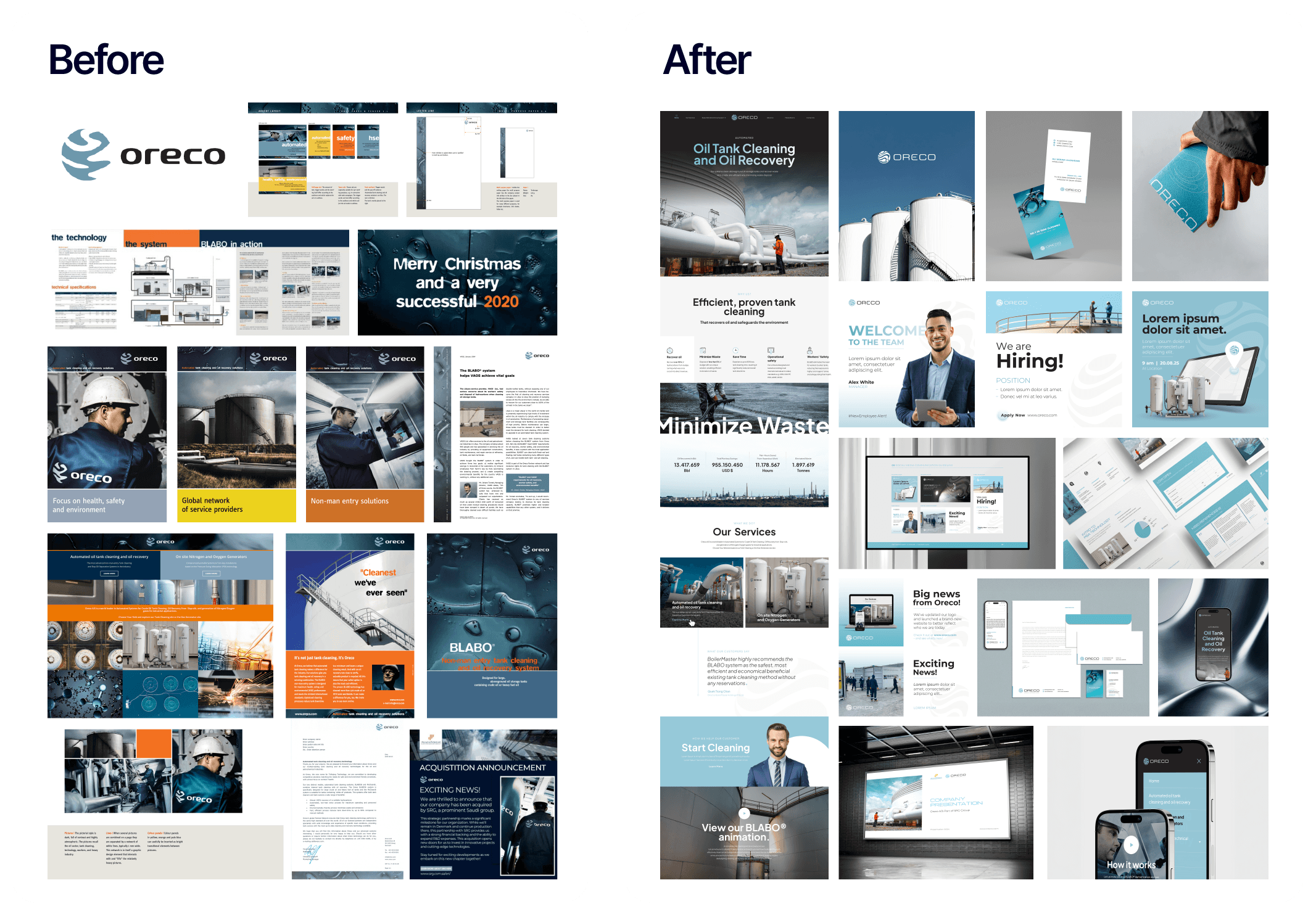 Left: The previous Oreco identity relied on dense text-heavy documents, dated layouts, and an inconsistent visual approach across brochures and presentations.