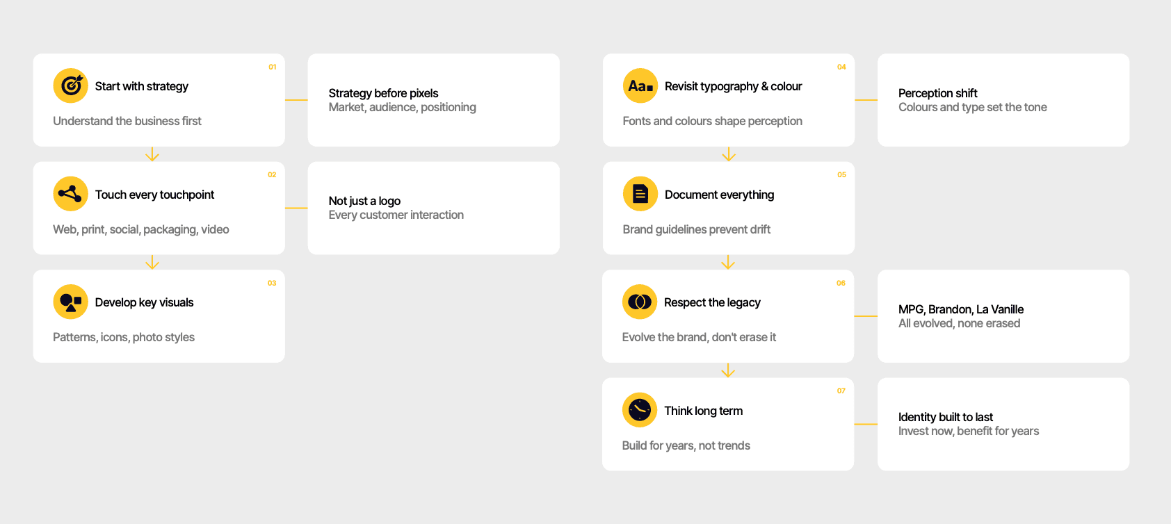 Respect the legacy. The best rebrands evolve a brand rather than erasing it. MPG kept its Fibonacci inspiration. Brandon Bioscience maintained its scientific credibility. La Vanille preserved its artisan warmth. A rebrand should feel like a natural progression, not a rejection of what came before.