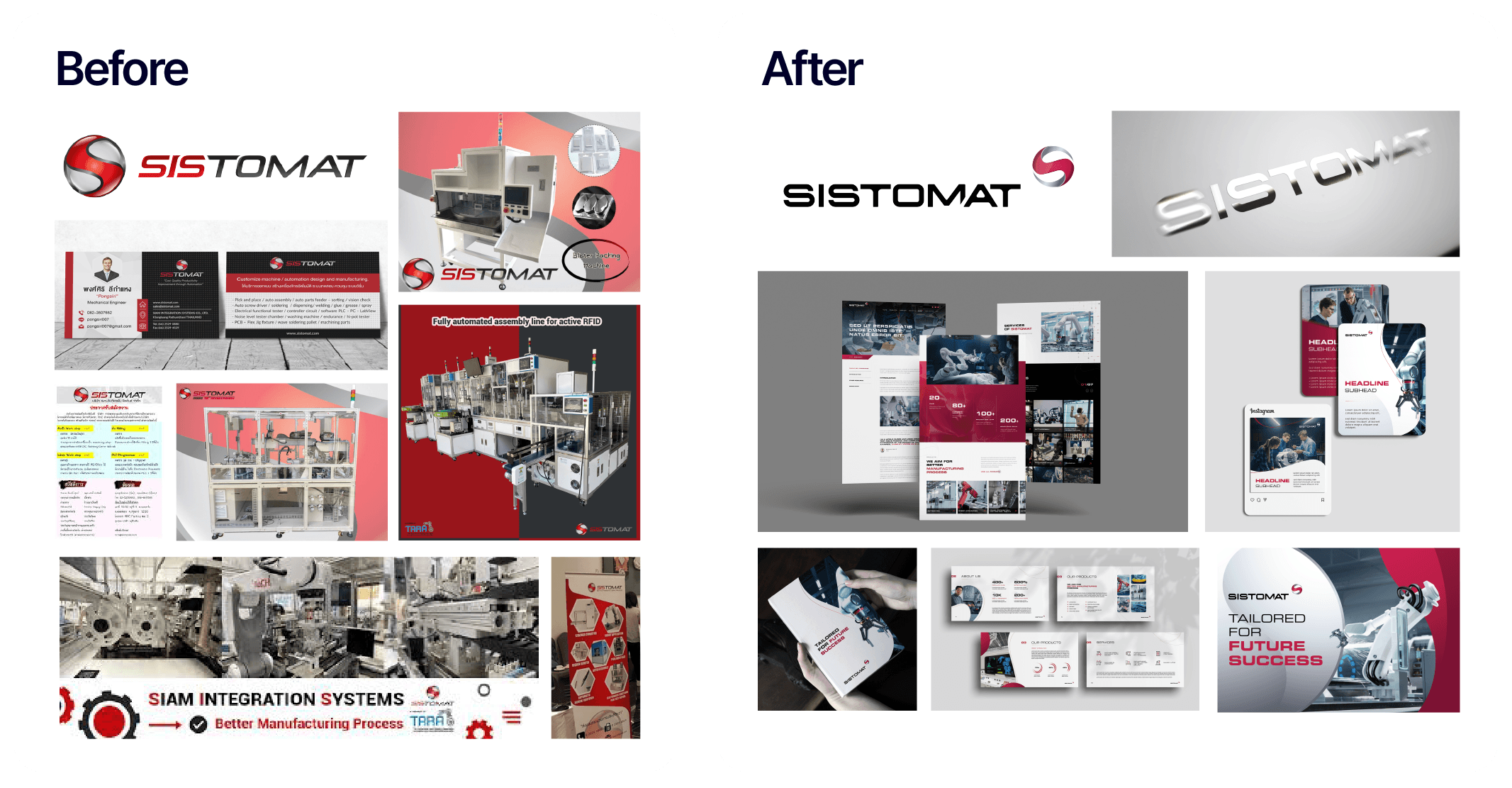 Left: The old Sistomat identity used a dated 3D-effect logo, cluttered business cards, dense product photography, and inconsistent marketing materials under the Siam Integration Systems parent brand.