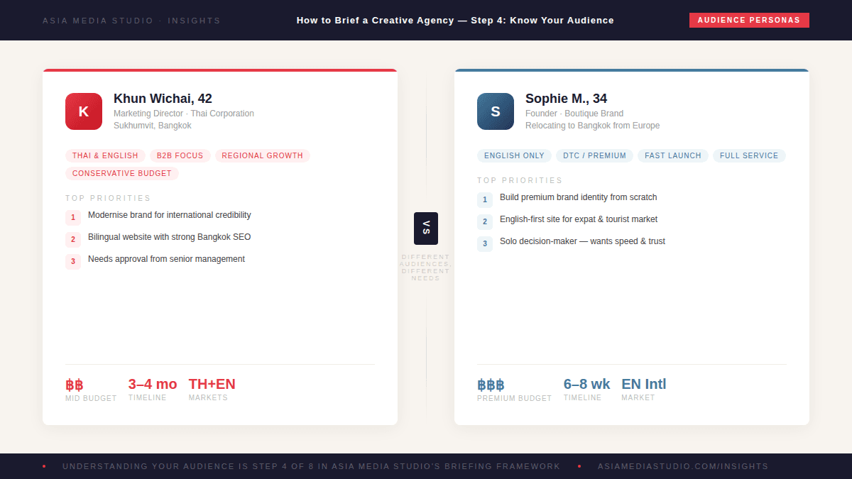 If you serve multiple audiences (e.g., Thai corporate clients and expat families), describe each one separately. A good agency will design different touchpoints for different people.
