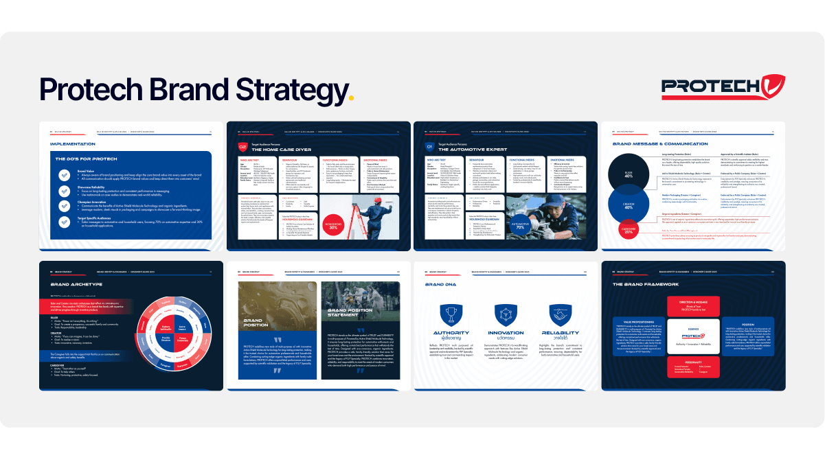 PROTECH required a complete brand identity system built on its "Active Shield Molecule Technology." The brand personality was structured around three pillars: Trusted Protector, Innovative Pioneer, and Sustainable Reliability — with a Ruler/Creator/Caregiver archetype split of 40/40/20. The resulting 56-page brand guideline covers everything from strategy and logo usage to packaging, digital guidelines, and mood and imagery direction.