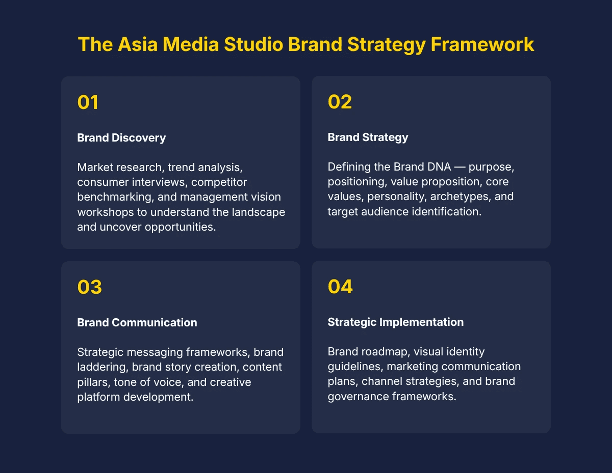 At Asia Media Studio, our brand strategy process is built on a simple principle: you can't build a strong brand on assumptions. Every project begins with deep research and discovery, because the most effective brand strategies are rooted in real-world insights — not guesswork.