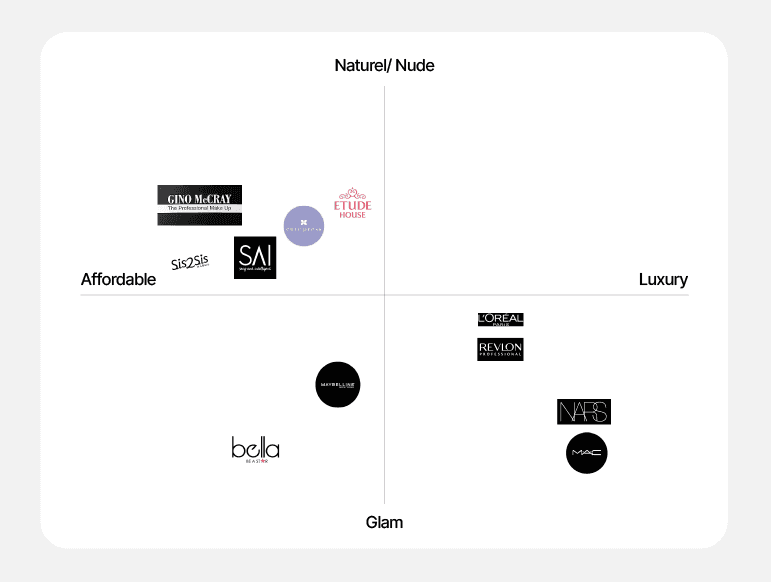 Every brand strategy we develop includes detailed competitive analysis. For the DKSH cosmetics brand, we mapped competitors across two axes — affordable to luxury, and natural/nude style to glam style — revealing a clear gap in the upper-right quadrant: natural-positioned, premium-quality cosmetics. This became the brand's strategic sweet spot.