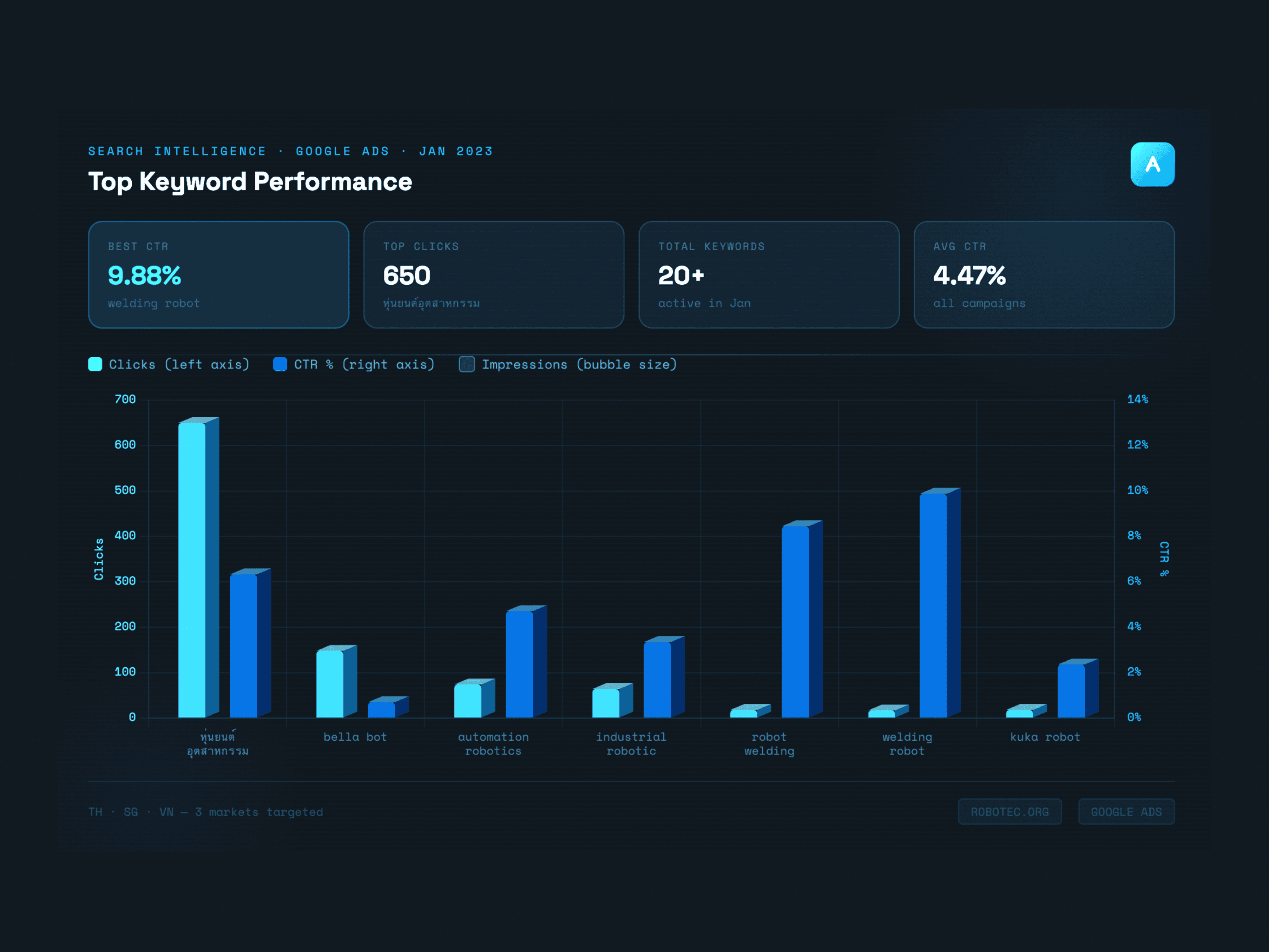 Industrial robotics is not a consumer category. Robotec’s target audience includes plant managers, production engineers, and operations directors who are driven by technical intent. They respond to credible, informative content and typically require multiple touchpoints before making a decision. The challenge had three key parts. First, identifying a keyword strategy to capture high intent searches in Thai, English, and Vietnamese. Second, creating display creatives that could stand out and drive action in a category often dominated by static, text-heavy visuals. Third, building a LinkedIn content program to educate audiences on automation ROI while positioning Robotec as a trusted integration partner rather than just a product reseller. For Robotec, every click needed to be meaningful. The focus was not on volume, but on reaching a clearly defined group of manufacturing decision makers across three markets, each with different dynamics. The strategy prioritized qualified engagement over broad reach.