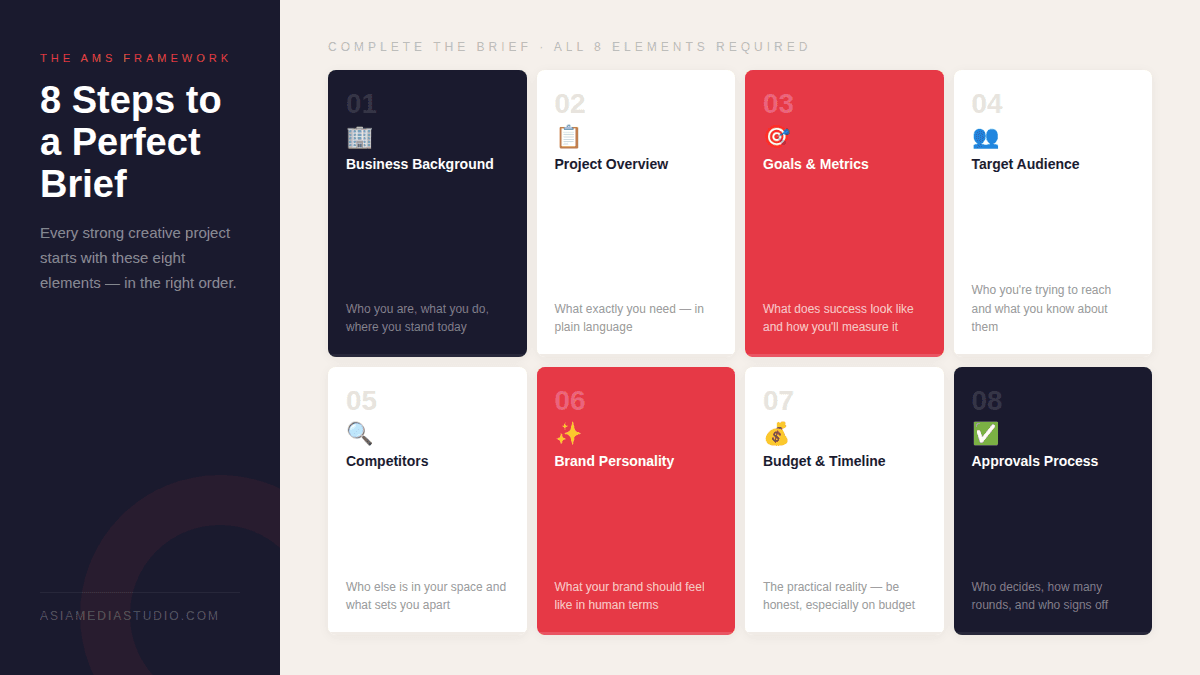 A Step-by-Step Guide for Bangkok Businesses You've decided it's time. You need a new brand identity, a website redesign, or a digital marketing campaign. You start approaching agencies — and then it happens: the process stalls, quotes come back wildly off-target, and the first creative concepts look nothing like what you had in mind. Most of the time, this isn't the agency's fault. It's the brief. A well-written creative brief is the single most important document in any agency engagement. It shapes every decision the creative team makes — from strategy, to design, to messaging. When it's done well, projects run on time, on budget, and on brand. When it's done poorly, everyone loses. At Asia Media Studio, we've been partnering with Bangkok businesses since 2007 — from local startups to international corporations. Browse our client portfolio to see the range of projects we've delivered. This guide distills everything we've learned into a practical, step-by-step process you can use right now.