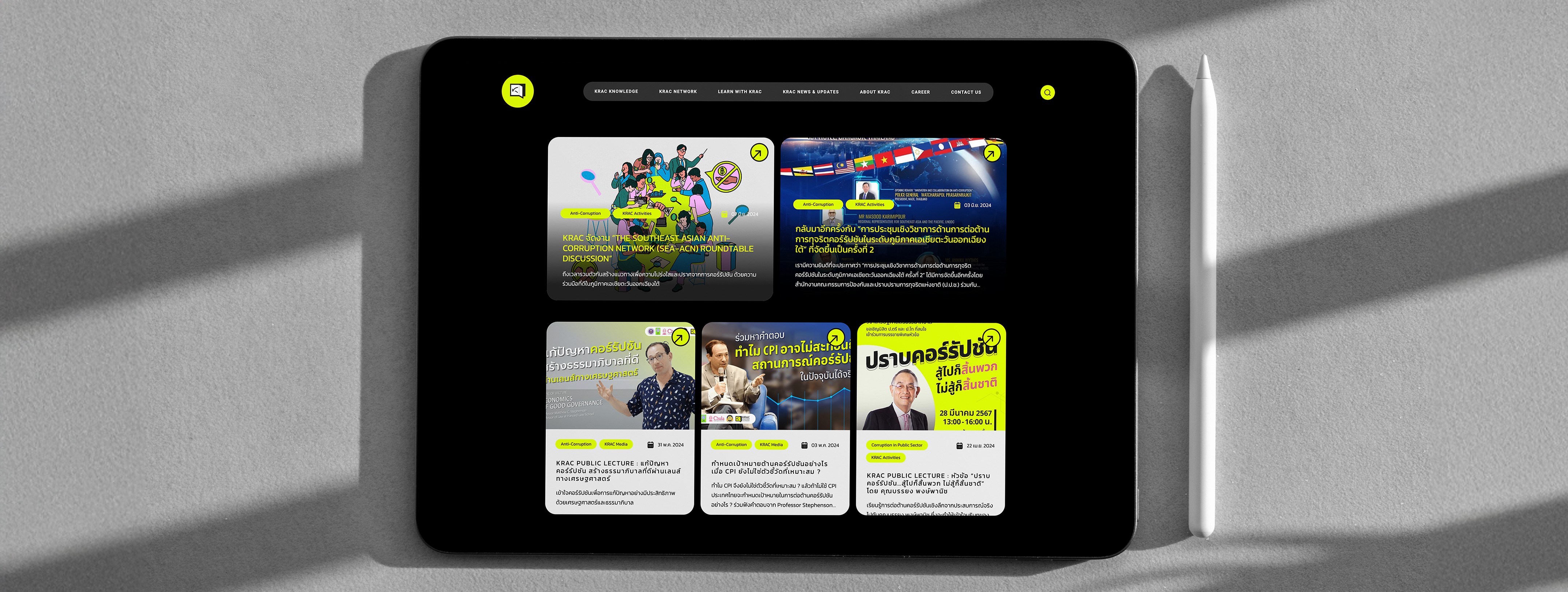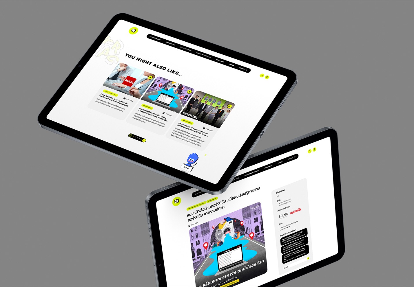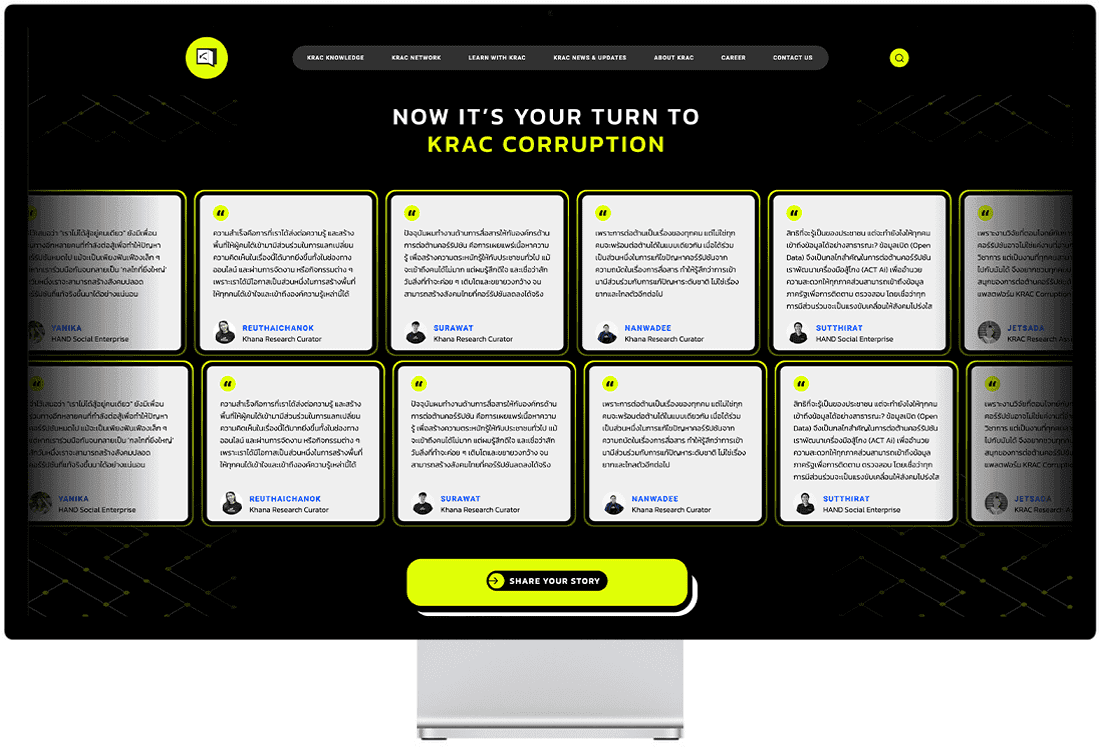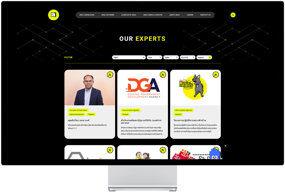 เอเชียมีเดียสตูดิโอออกแบบ UI ที่ดึงดูดสายตาด้วยเลย์เอาต์ที่สะอาดตา โครงสร้างข้อมูลที่ชัดเจน และการใช้ภาพที่มีกลยุทธ์ โดยการให้ความสำคัญกับการออกแบบ UX/UI เราได้เปลี่ยนฐานความรู้ของ KRAC ให้เป็นศูนย์กลางที่มีพลังสำหรับผู้เชี่ยวชาญด้านการต่อต้านคอร์รัปชัน และทำให้พวกเขาสามารถเข้าถึงทรัพยากรได้ในขณะที่ทำให้การค้นหาข้อมูลง่ายสำหรับผู้เยี่ยมชม.