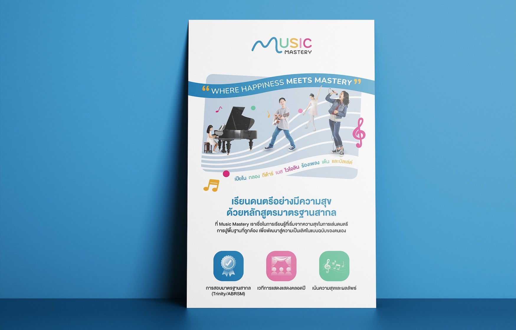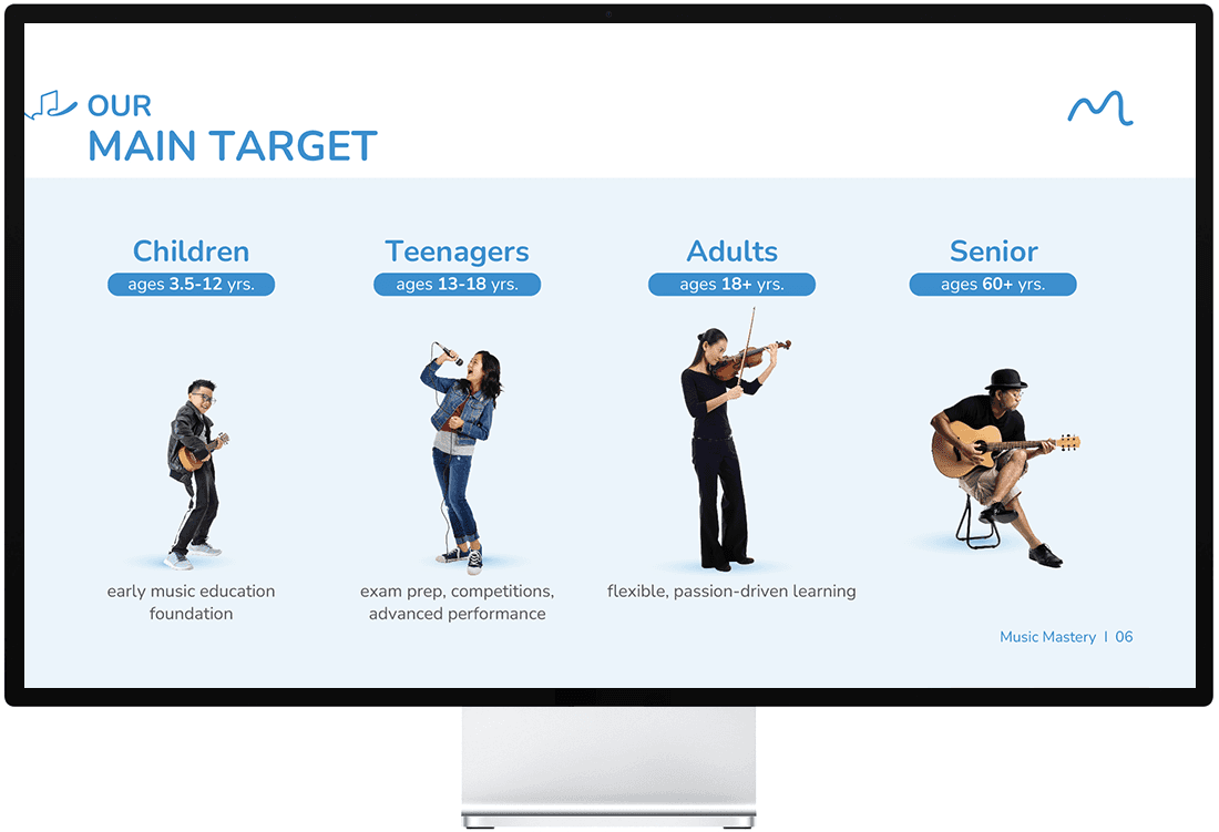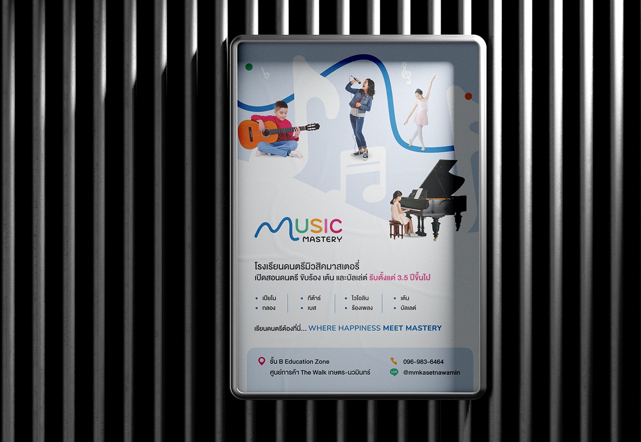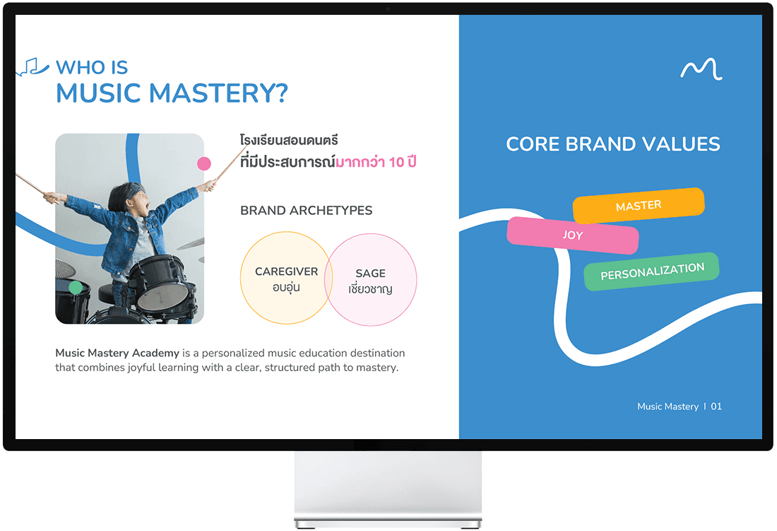 เอเชีย มีเดีย สตูดิโอได้เป็นผู้นำกระบวนการพัฒนาแบรนด์สำหรับ Music Mastery Academy โดยเริ่มจากกลยุทธ์แบรนด์ เราได้กำหนดวัตถุประสงค์ ค่านิยม การวางตำแหน่ง และวิสัยทัศน์ระยะยาวของสถาบันในตลาดการศึกษาด้านดนตรี ในระยะเริ่มต้น เราได้พัฒนาทิศทางการตั้งชื่อแบรนด์และการวางตำแหน่ง เพื่อให้มีการสื่อสารความเชี่ยวชาญ การเรียนรู้ที่สนุกสนาน และเส้นทางที่มีโครงสร้างสู่ความเชี่ยวชาญอย่างชัดเจน รากฐานเชิงกลยุทธ์นี้ได้ชี้นำการตัดสินใจสร้างสรรค์และการออกแบบทั้งหมด ตามทิศทางที่อนุมัติแล้ว เราได้สร้างระบบอัตลักษณ์แบรนด์ที่สมบูรณ์ รวมถึงสไตล์ภาพและข้อความแบรนด์ เพื่อให้แน่ใจว่ามีความสอดคล้องกันในทุกจุดสัมผัสของแบรนด์ เมื่อกลยุทธ์และอัตลักษณ์แบรนด์ถูกสรุปแล้ว เอเชีย มีเดีย สตูดิโอได้พัฒนาหมายกำหนดการแบรนด์ที่ครอบคลุมซึ่งรวมทุกองค์ประกอบของแบรนด์เข้าด้วยกันและสนับสนุนการสื่อสารที่สม่ำเสมอ การขยายในอนาคต และการเติบโตของแบรนด์ในระยะยาว