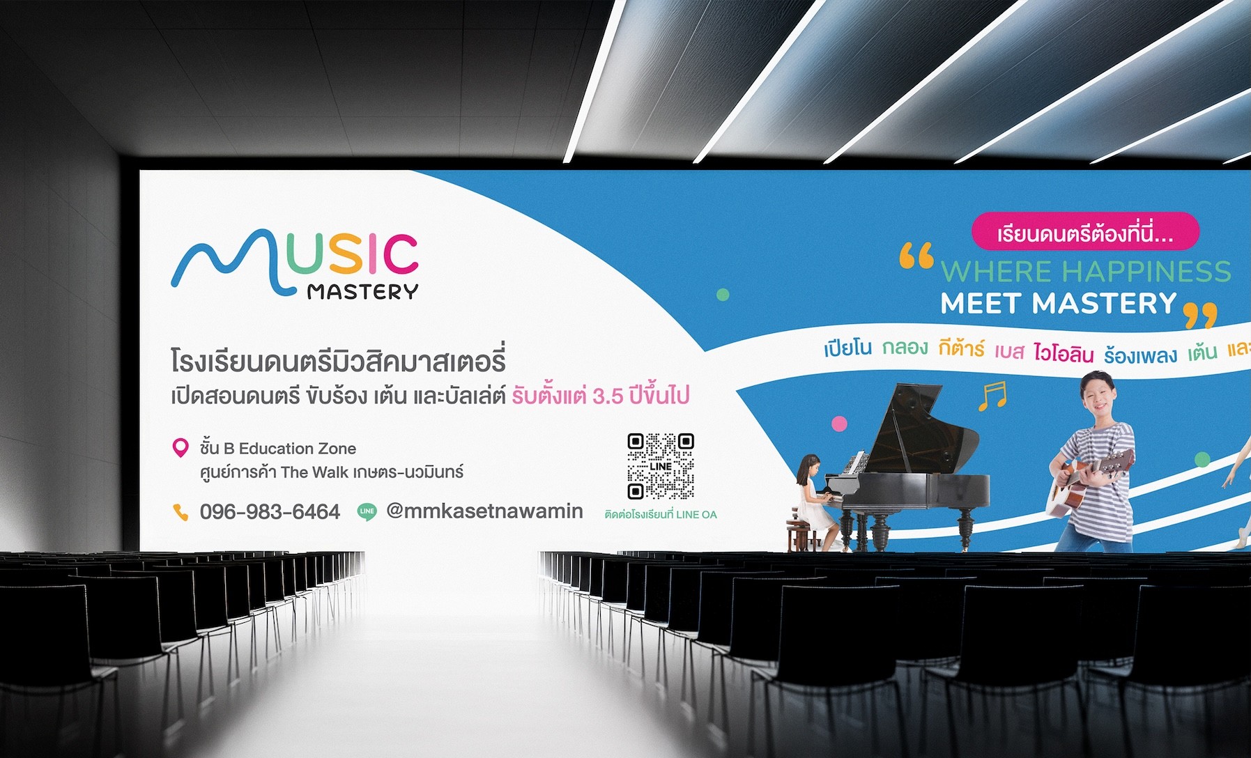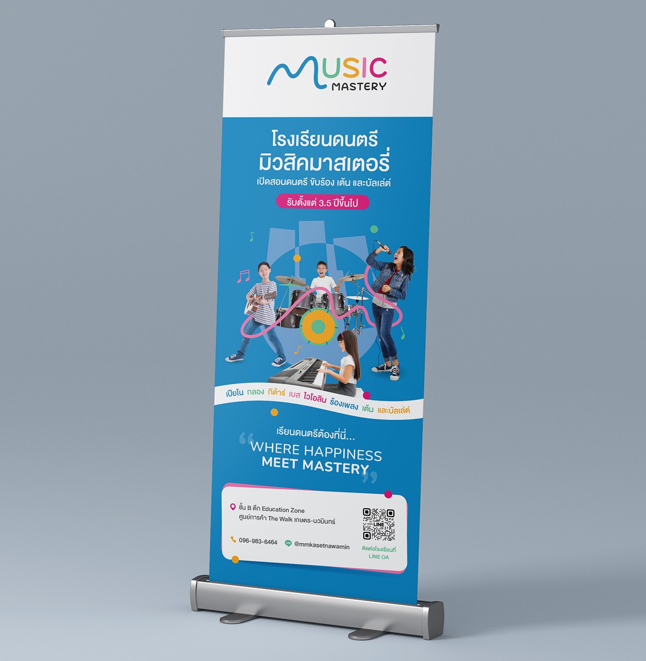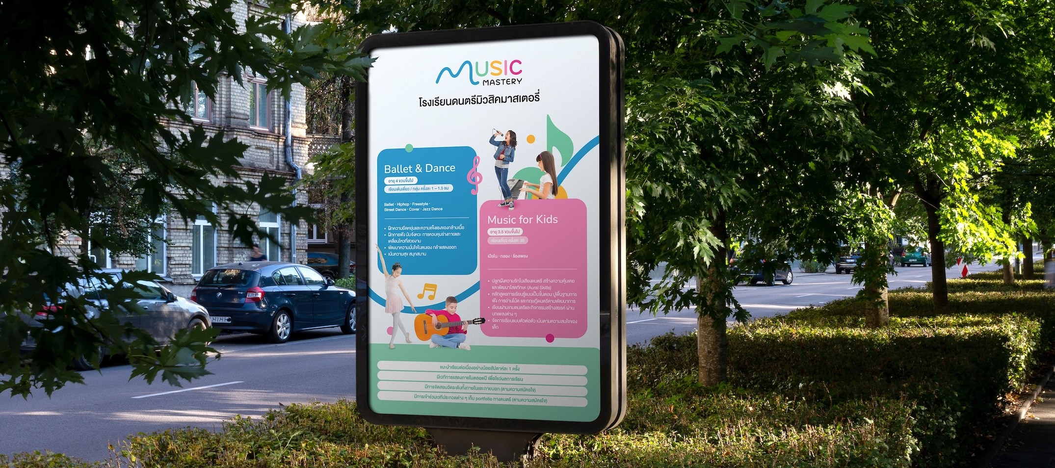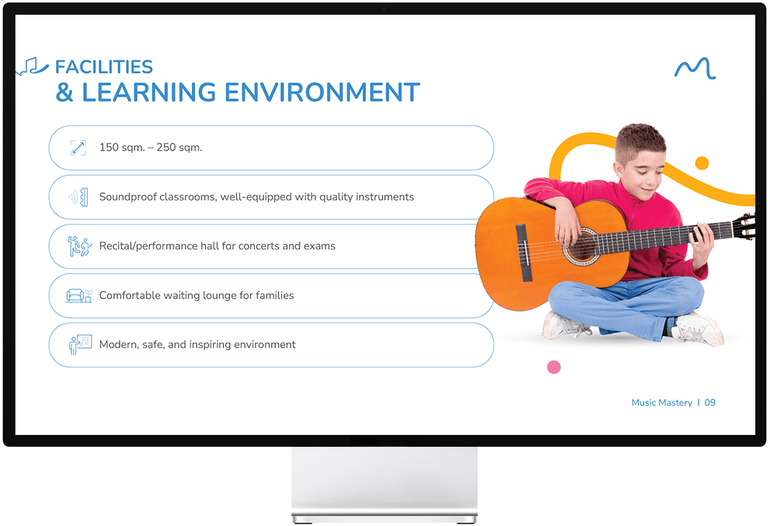 เอเชีย มีเดีย สตูดิโอได้เป็นผู้นำกระบวนการพัฒนาแบรนด์สำหรับ Music Mastery Academy โดยเริ่มจากกลยุทธ์แบรนด์ เราได้กำหนดวัตถุประสงค์ ค่านิยม การวางตำแหน่ง และวิสัยทัศน์ระยะยาวของสถาบันในตลาดการศึกษาด้านดนตรี ในระยะเริ่มต้น เราได้พัฒนาทิศทางการตั้งชื่อแบรนด์และการวางตำแหน่ง เพื่อให้มีการสื่อสารความเชี่ยวชาญ การเรียนรู้ที่สนุกสนาน และเส้นทางที่มีโครงสร้างสู่ความเชี่ยวชาญอย่างชัดเจน รากฐานเชิงกลยุทธ์นี้ได้ชี้นำการตัดสินใจสร้างสรรค์และการออกแบบทั้งหมด ตามทิศทางที่อนุมัติแล้ว เราได้สร้างระบบอัตลักษณ์แบรนด์ที่สมบูรณ์ รวมถึงสไตล์ภาพและข้อความแบรนด์ เพื่อให้แน่ใจว่ามีความสอดคล้องกันในทุกจุดสัมผัสของแบรนด์ เมื่อกลยุทธ์และอัตลักษณ์แบรนด์ถูกสรุปแล้ว เอเชีย มีเดีย สตูดิโอได้พัฒนาหมายกำหนดการแบรนด์ที่ครอบคลุมซึ่งรวมทุกองค์ประกอบของแบรนด์เข้าด้วยกันและสนับสนุนการสื่อสารที่สม่ำเสมอ การขยายในอนาคต และการเติบโตของแบรนด์ในระยะยาว