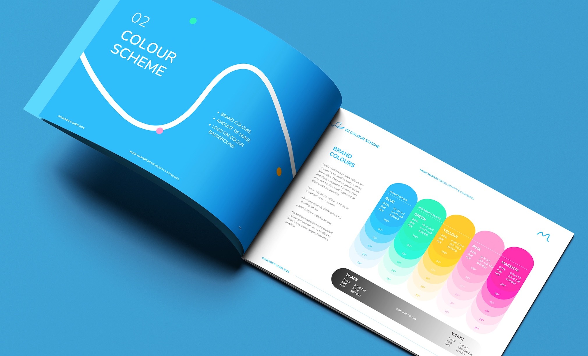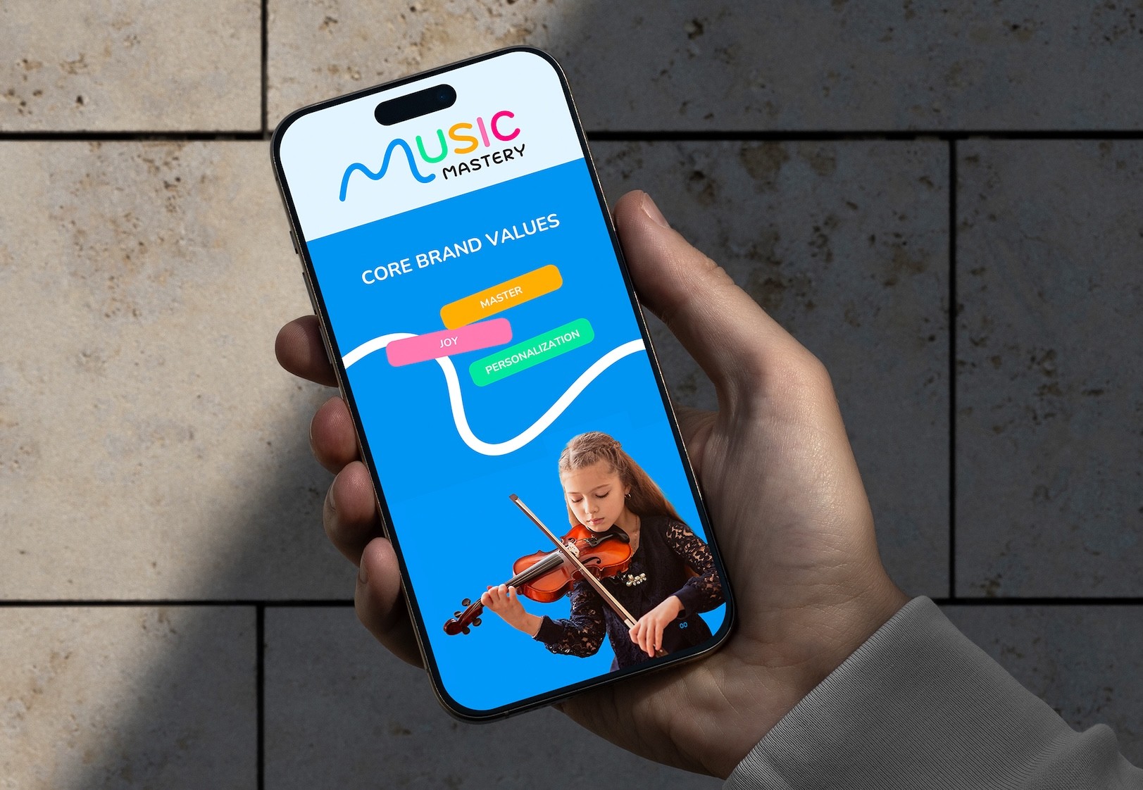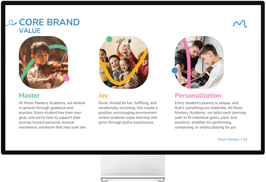 เพื่อให้ประสบการณ์แบรนด์ที่สอดคล้องและเป็นมืออาชีพ Asia Media Studio ได้ปรับแต่งองค์ประกอบแบรนด์หลักทั้งหมดให้สอดคล้องกันในแต่ละจุดสัมผัสของ Music Mastery Academy ฟอนต์ สี และสไตล์ภาพรวมทั้งหมดถูกนำมาใช้โดยพิจารณาเพื่อสร้างสภาพแวดล้อมการเรียนรู้ที่สอดคล้องซึ่งสะท้อนคุณค่าของสถาบัน ได้แก่ ความเชี่ยวชาญ การเอาใจใส่ และการเรียนรู้ที่เต็มไปด้วยความสุข