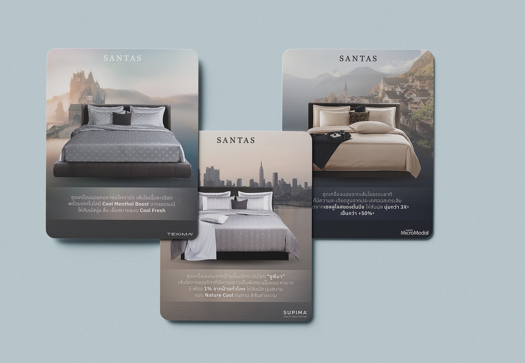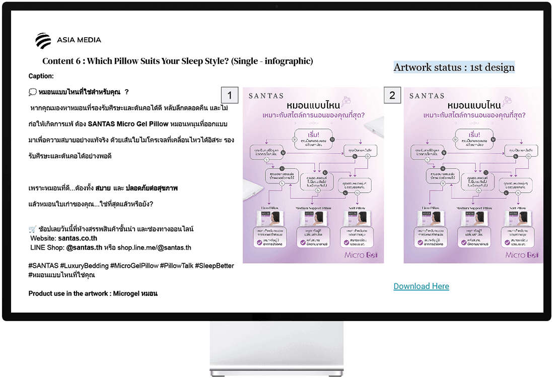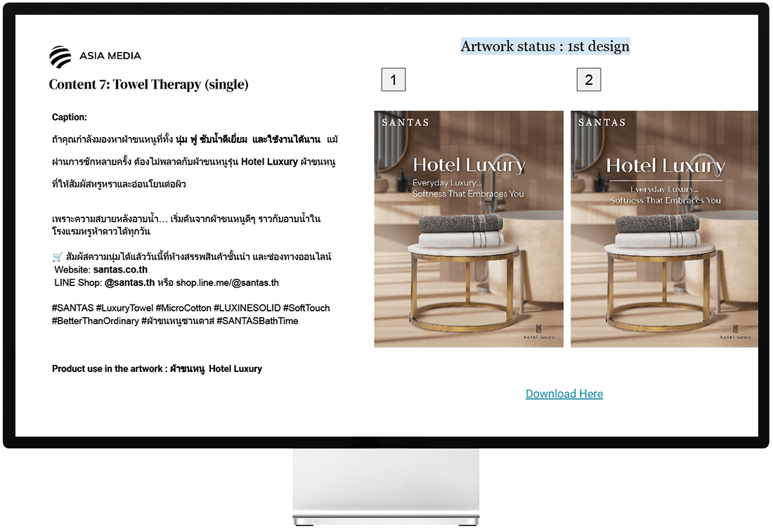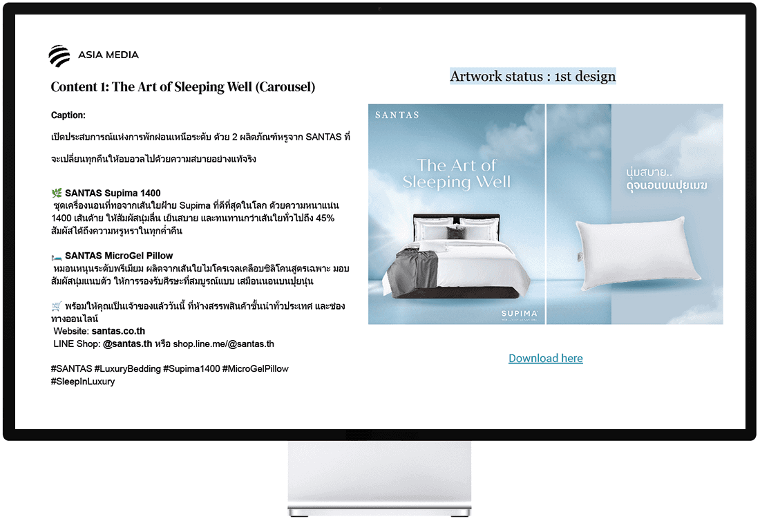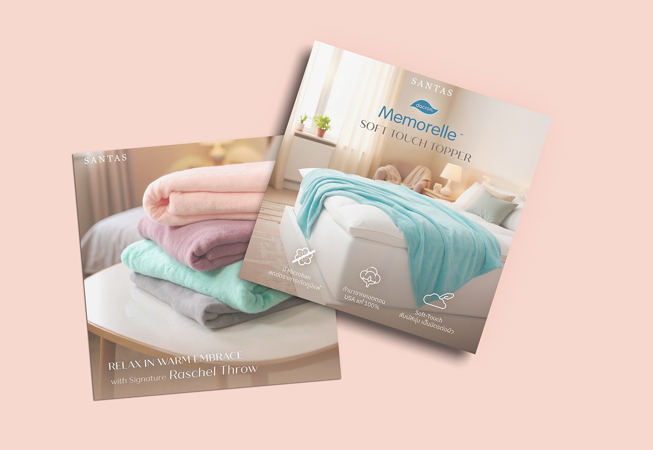เพื่อให้มีการนำเสนอแบรนด์ที่สม่ำเสมอและมีคุณภาพ เอเชีย มีเดีย สตูดิโอได้ปรับให้ภาพแคมเปญทั้งหมดสอดคล้องกับอัตลักษณ์ของแบรนด์ SANTAS เราจัดการการใช้ฟอนต์ สี และสไตล์การมองเห็นเพื่อสร้างลุคที่สอดคล้องกันซึ่งสะท้อนถึงมาตรฐานคุณภาพและตำแหน่งทางสไตล์ของ SANTAS อย่างชัดเจนในสื่อการตลาดทั้งหมด