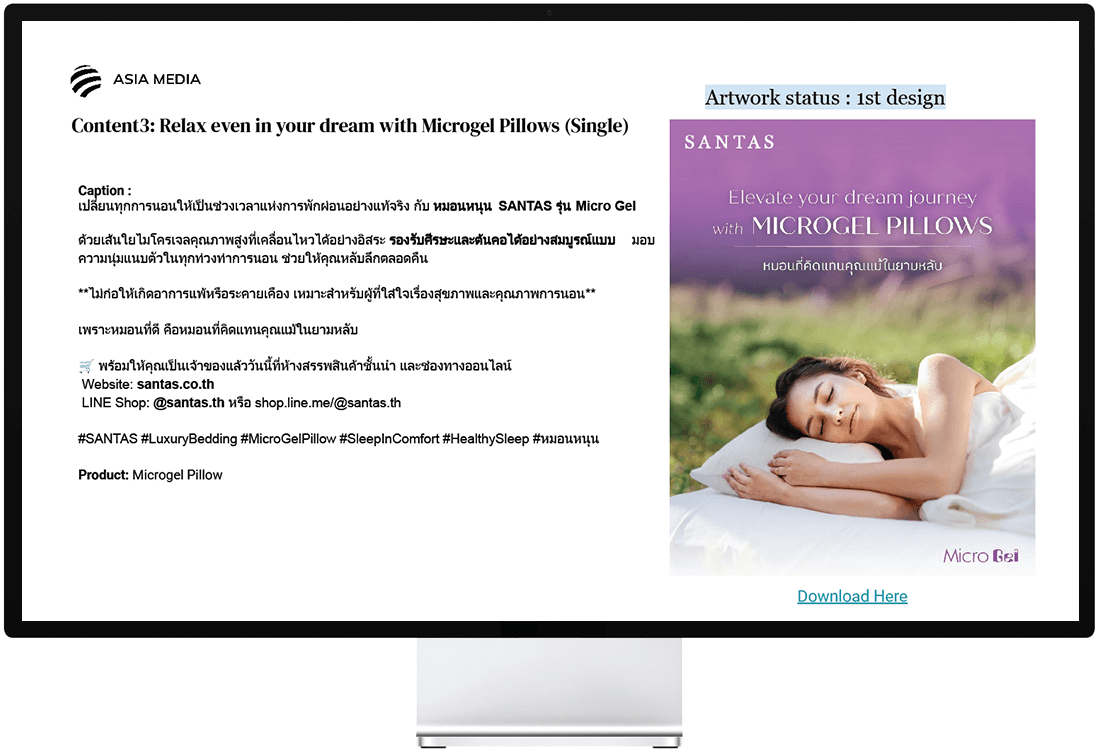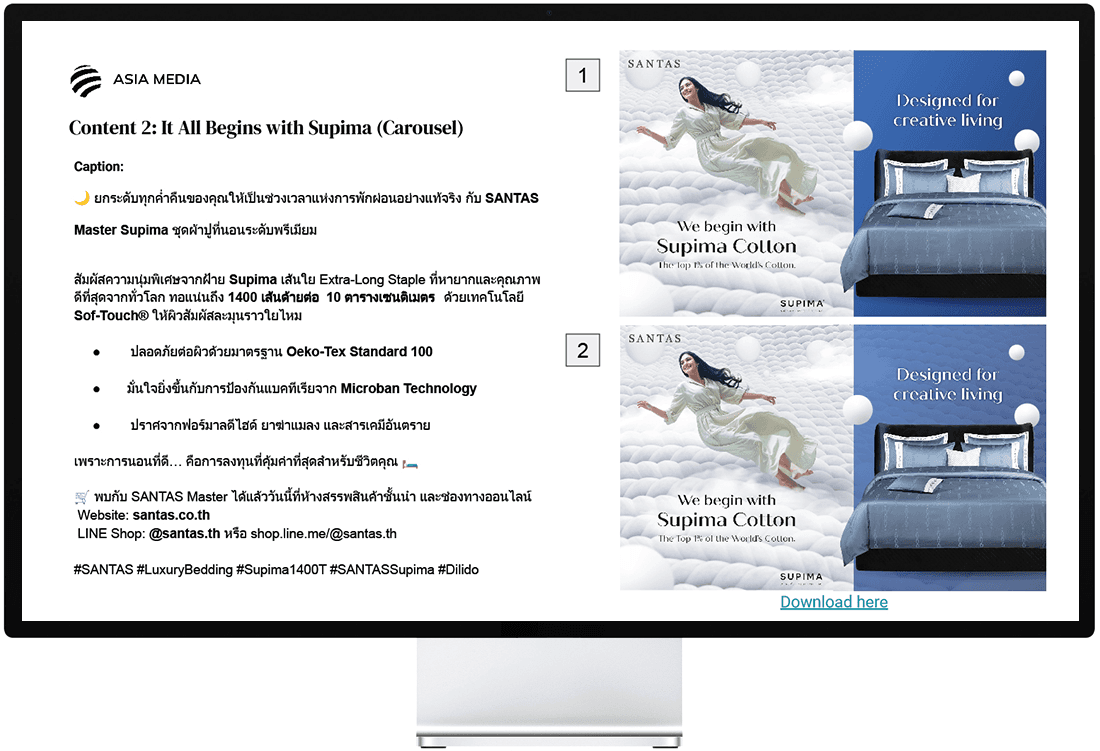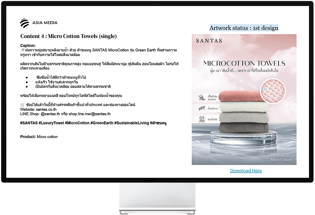 Asia Media Studio ได้ร่วมมือกับ SANTAS เพื่อตั้งแผนและบริหารจัดการแคมเปญการสร้างการรับรู้แบรนด์ที่มุ่งเน้นไปที่การมองเห็น การมีส่วนร่วม และการรับรู้แบรนด์ เราได้ทำให้มั่นใจว่าแคมเปญทั้งหมดสะท้อนถึงคุณภาพพรีเมียมและการวางตำแหน่งวิถีชีวิตของ SANTAS บนแพลตฟอร์มดิจิทัลอย่างชัดเจน